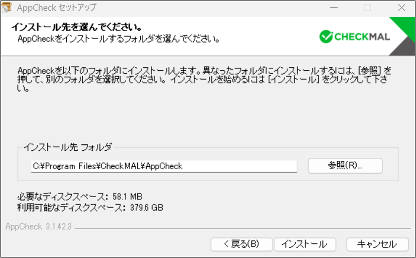 3.インストール先フォルダを確認し、「インストール」ボタンをクリックします。